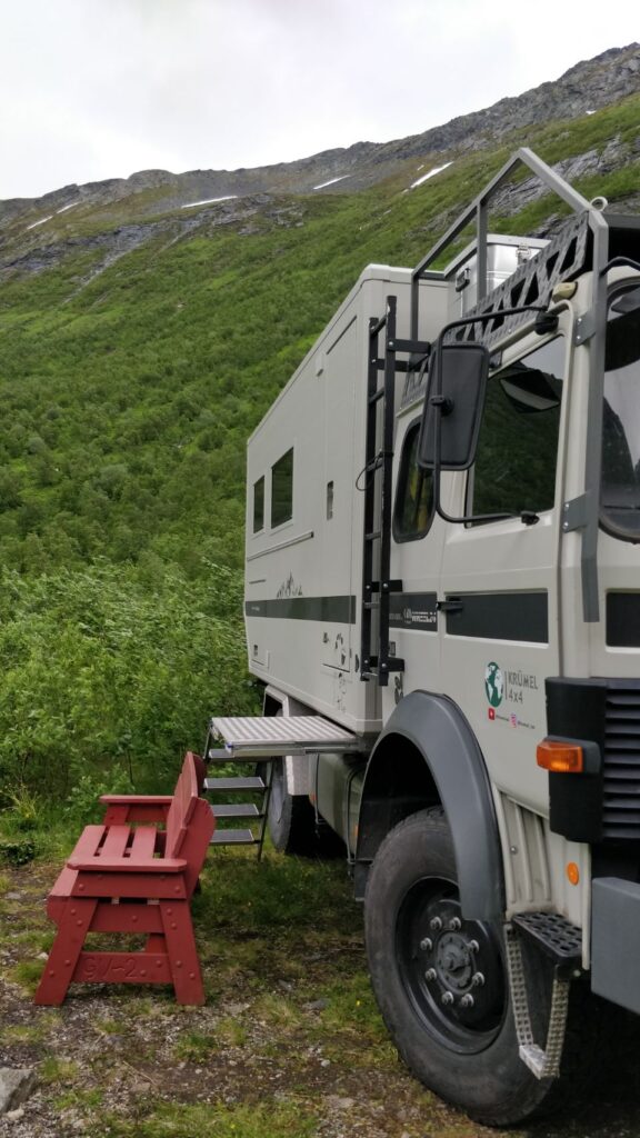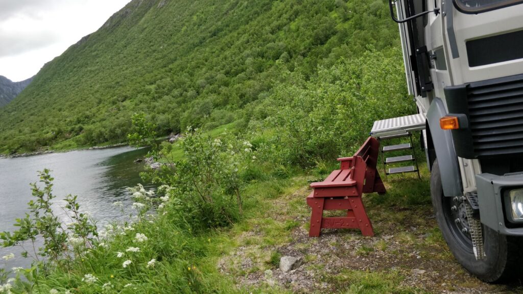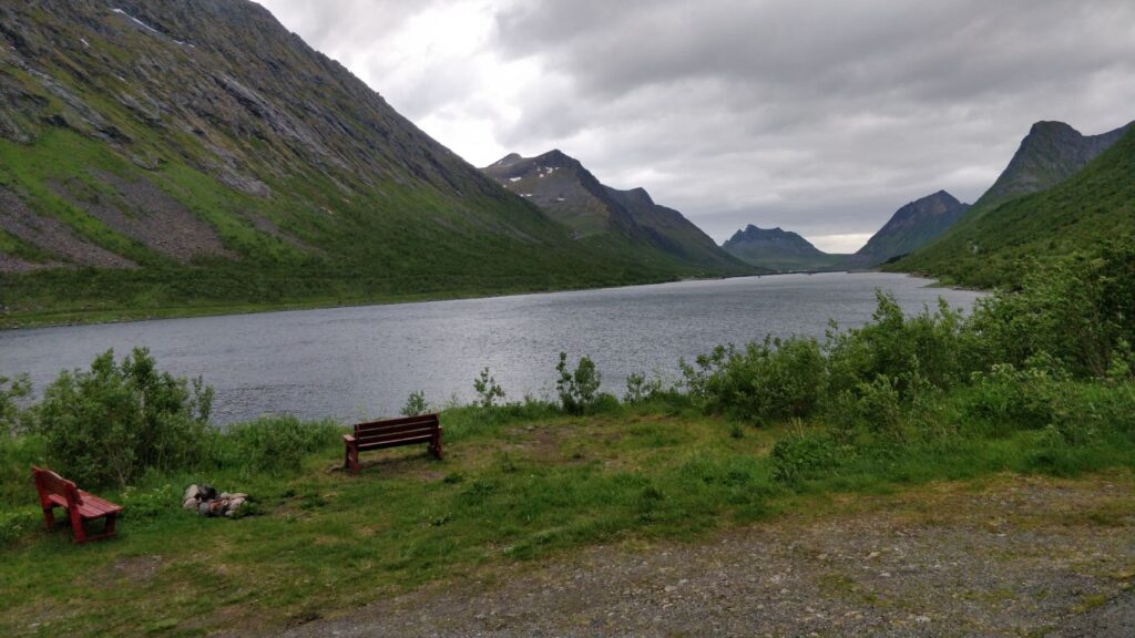 Wir fahren nicht mehr großartig weiter sondern nur bis sozusagen ans „Dead End“ des Gryllefjord auf der alten Straße. Dieser Abschnitt ist eine Sackgasse und wird nicht mehr viel genutzt, da eine es mittlerweile weiter vorn eine Brücke gibt. Der Stellplatz ist sehr schön, mit tollem Blick über den ganzen Fjord, es fehlen nur mal wieder so ca. 10 bis 15 Grad wärmer und etwas weniger Wind zum Glück. In der Nacht wächst der Wind übrigens zum ordentlichen Sturm an, so gelegentlich grübeln wir schon mal, ob der KRÜMEL nicht gleich auf der Seite liegt….