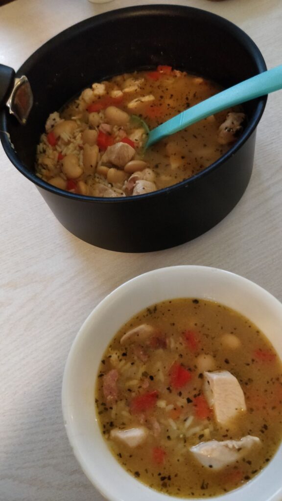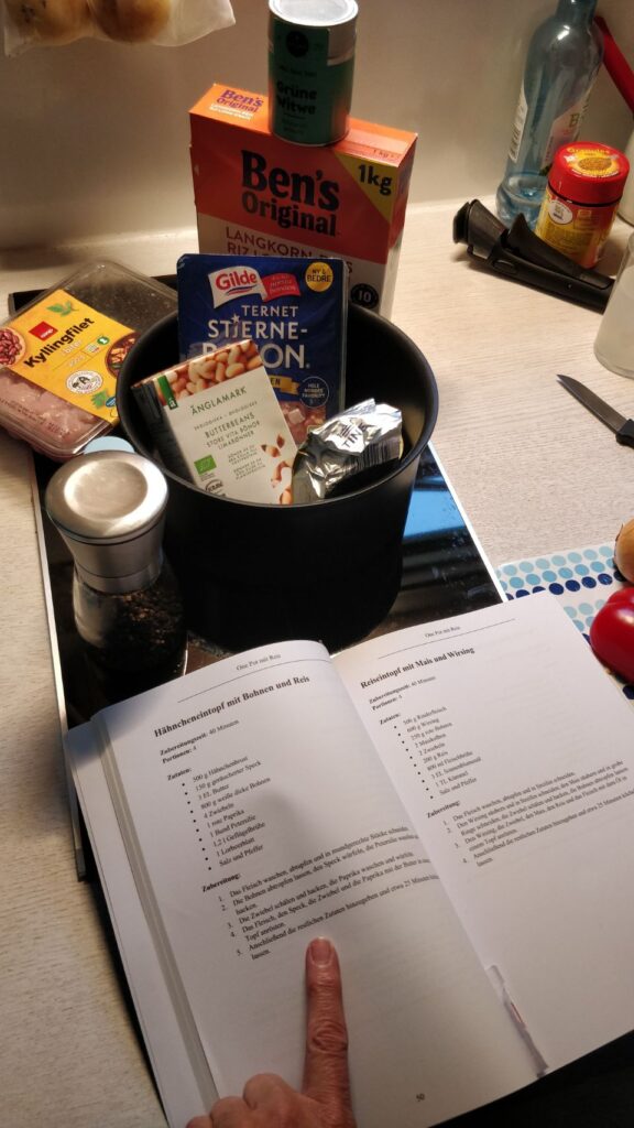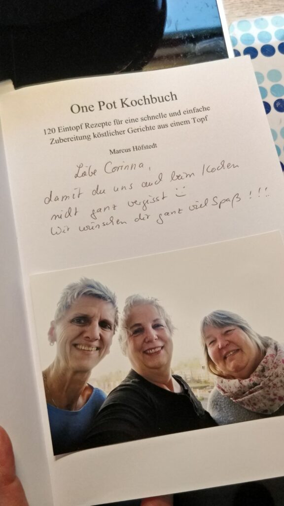 Meine lieben Kolleginnen Jutta, Gabi und Sabine haben mir nämlich ein schönes Kochbuch für die Reise geschenkt und daraus wird heute etwas gekocht: es gibt Hähncheneintopf mit Bohnen und Reis. Gesagt, gekocht, gegessen. Hat alles gut geklappt  und sowohl mir als auch dem Göttergatten super geschmeckt . Deshalb an dieser Stelle noch mal ein großes Dankeschön an meine lieben Fanta 4 Girls, ich hatte definitiv Spaß beim Kochen und es hat richtig lecker geschmeckt. Liebe Grüße nach Hause