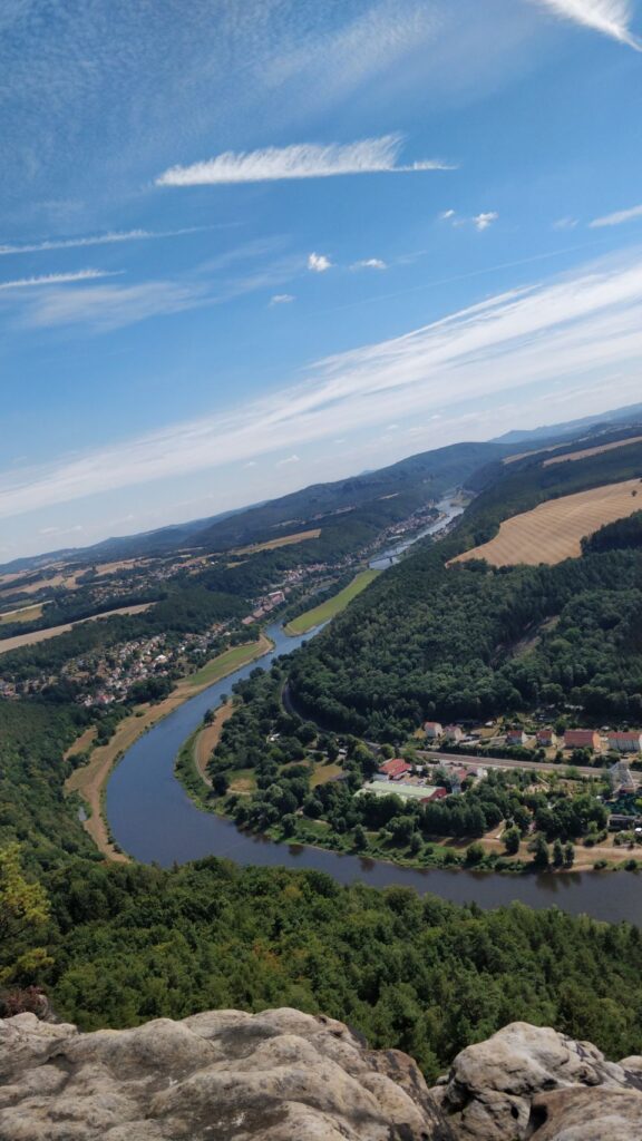 Bergauf ist ja nicht so meine Disziplin, außerdem ist es mega heiß, aber wir haben Glück und der Weg ist meistens im Schatten und ich schlage mich tapfer bis zum Plateau Lilienstein auf 415 m Höhe. Dort werden wir mit einer 360 Grad-Rundum-Aussicht belohnt .